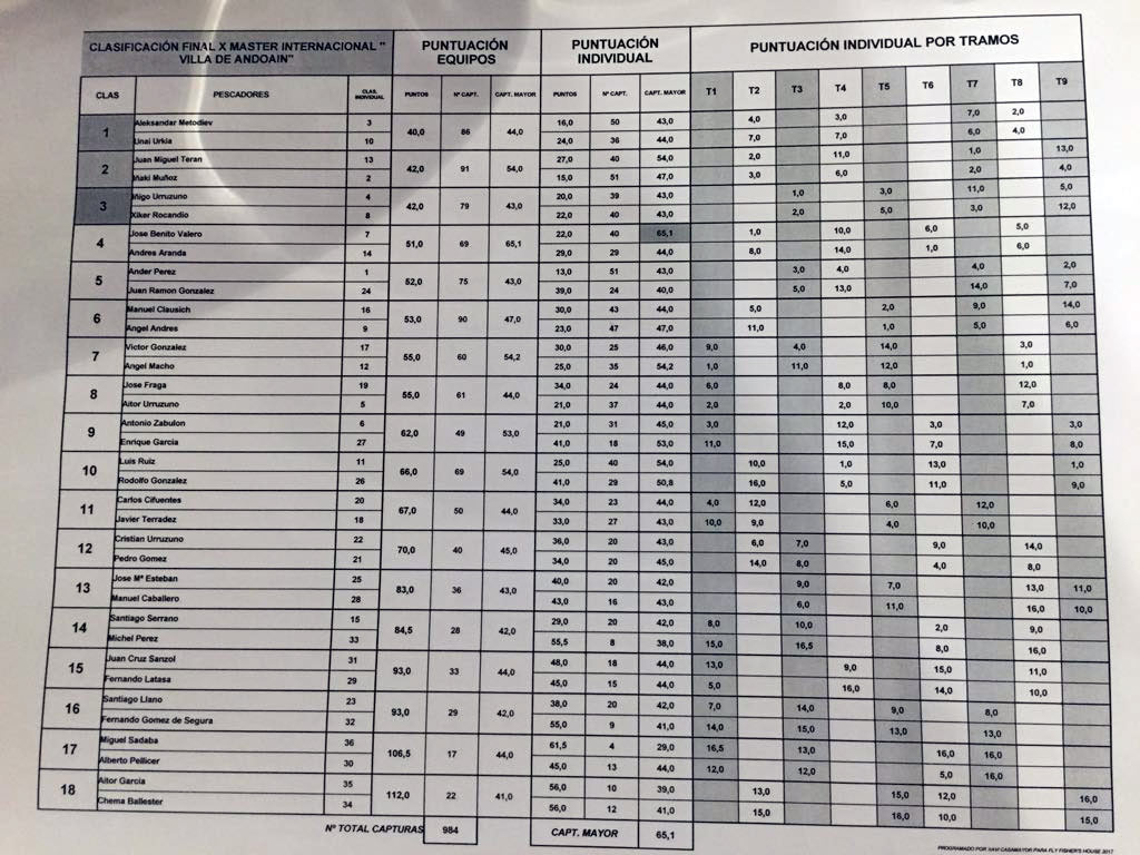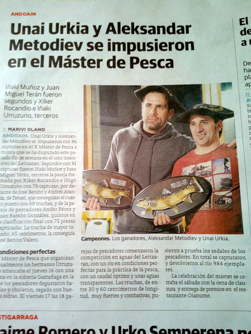 Entre truchas comunes triploides ("manolos") y arco iris se pescaron casi 1000 truchas, entraban muy bien a ovejitas, pompones y ninfas, a estrímer eran mas reacias, mucha camaraderia entre los participantes, buen ambiente y felicitar a Unai Urkia y Aleksandar Metodiev que fueron los vencedores de esta edición, en segunda posición la pareja local, Iñaki Muñoz y Juan Miguel Terán y terceros Iñigo Urruzuno y Xiker Rocandio, José Benito capturó la trucha mayor con una iris de 65,1 centímetros.