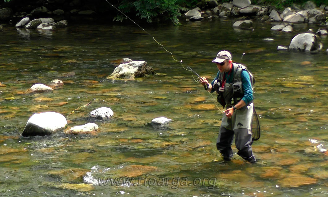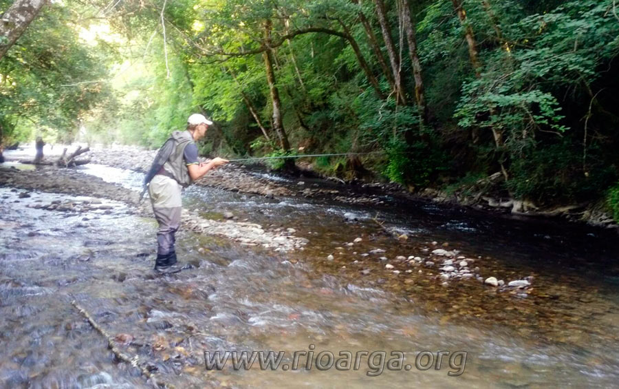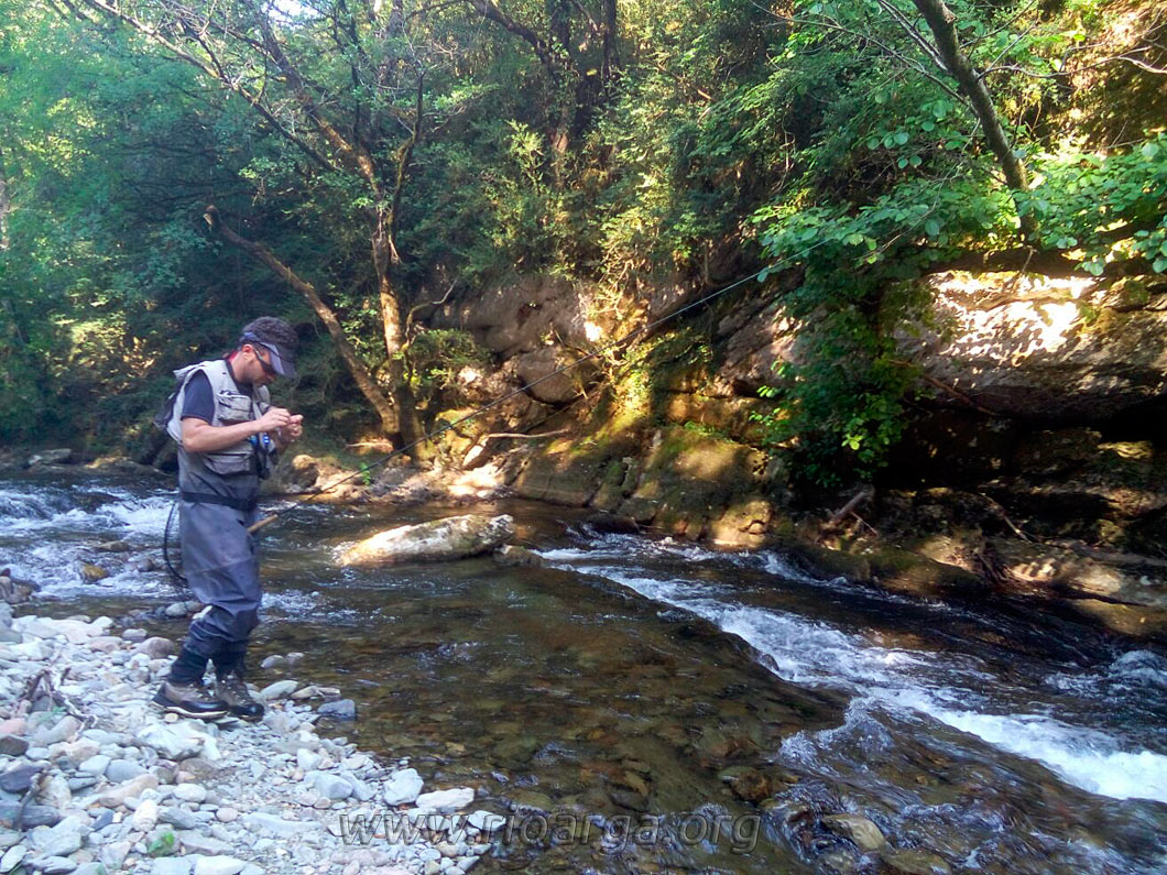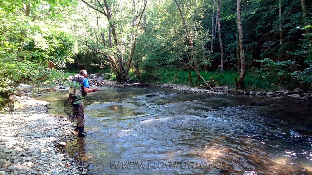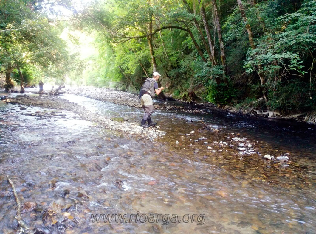 La cuarta hora ya con el sol castigando menos y con más zonas de sombra hizo que las truchas se animasen algo más en algunos tramos y se pescasen 25 ejemplares menores de 19 cm y 18 truchas por encima de esa medida, la mayoría de ellas a tándem y mosca seca.