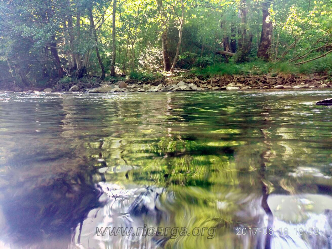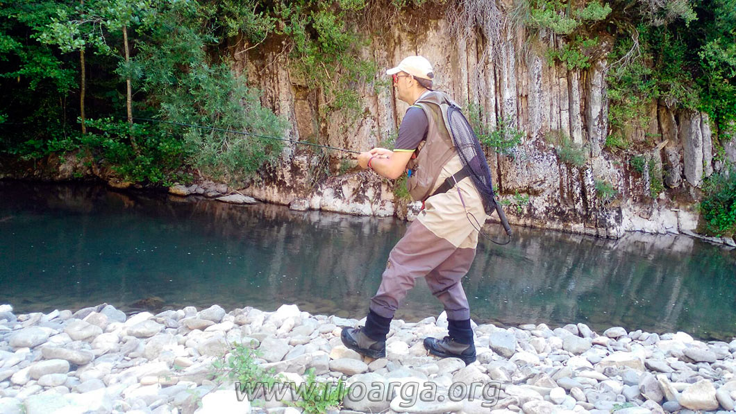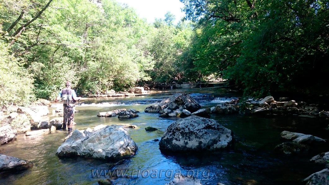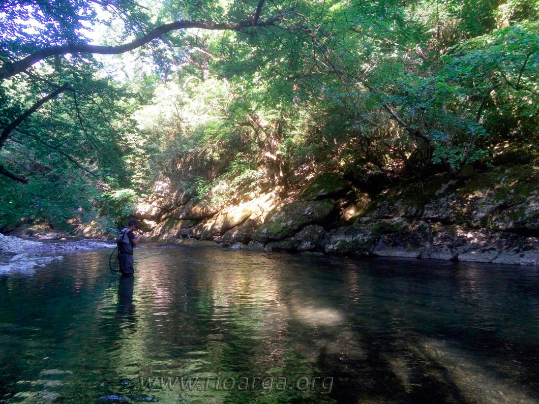 La cuarta hora ya con el sol castigando menos y con más zonas de sombra hizo que las truchas se animasen algo más en algunos tramos y se pescasen 25 ejemplares menores de 19 cm y 18 truchas por encima de esa medida, la mayoría de ellas a tándem y mosca seca.