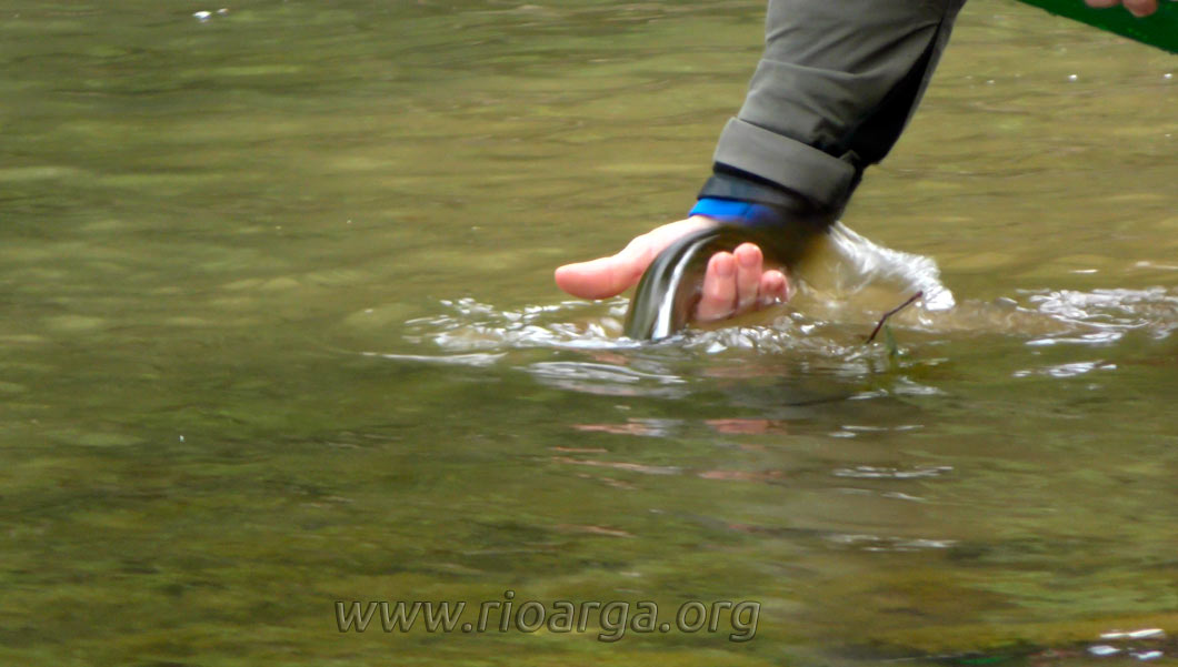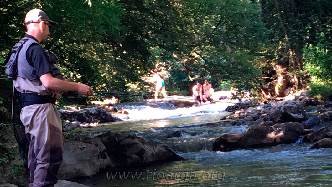Después de una merecida parada para ir a reponer fuerzas e hidratarse un rato comenzaban a las 15:20 las mangas de la tarde bajo un sol de justicia y el mercurio rozando los 38° lo cual hizo que la actividad de las truchas bajase mucho, contabilizándose 15 ejemplares por debajo de los 19 cm y 17 por encima.