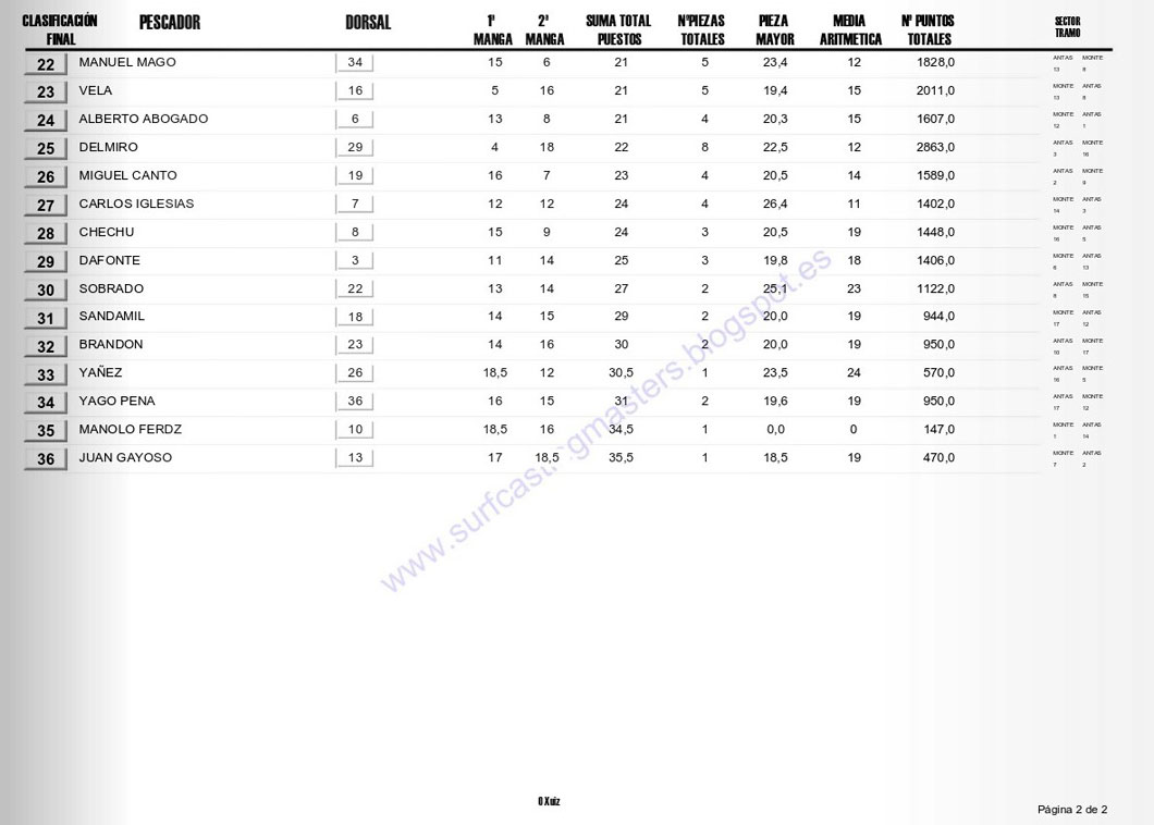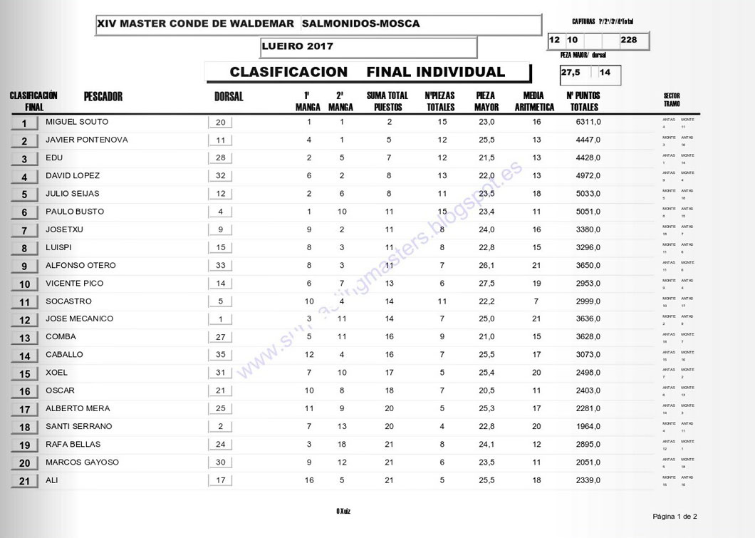 El ganador, Miguel Souto sumando 15 truchas en las dos mangas, segundo Javier Pontenova con 12 de ellas y tercero Eduardo Fuentes (Escarcha) también con 12 truchas, Juan Gayoso el último clasificado al cual se le entregó un pan gigante con la forma de un cero.